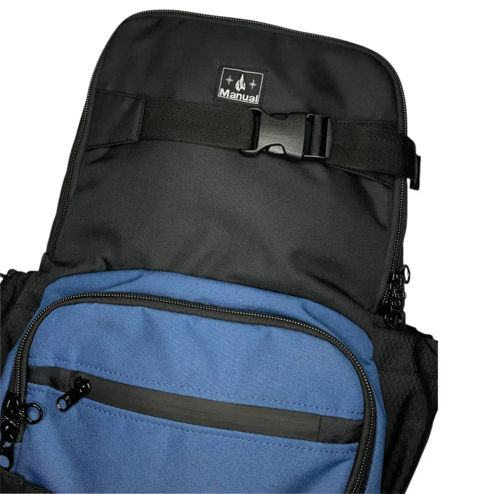 Maleta porta skate Manual Skateboards // Fabricada en lona morral de alta resistencia, cremalleras y cierres eka, herrajes jordao de elite, reatas de seguridad, dobles costuras en tirantes y correas para reforzarlas, acolchados en espalda y tirantes, espacio para PC, Capacidad 24 Litros - Color negro - azul // Producto Hecho en colombia - Costal de Anzuelos Skateshop Local